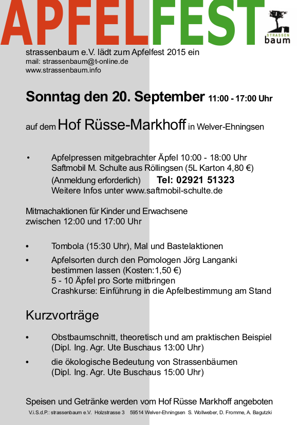 Am Sonntag, den 20. September 2015 zwischen 11.00 Uhr und 17.00 Uhr lud der Verein strassenbaum e.V. zu einem Apfelfest rund um den Apfel auf den Hof Rüsse-Markhoff in Welver-Ehningsen ein. Wir wollten durch dieses Fest auf die Bedeutung und den Erhalt von Straßenbäumen im Kreis Soest aufmerksam machen. Auf dem Apfelfest gab es unter anderem Gelegenheit, selbstgeerntete Äpfel pressen zu lassen. Das Saftmobil von Michael Schulte aus Röllingsen war an diesem Tag eigens auf dem Hof Rüsse-Markhoff aufgestellt. Zwischen 12.00 und 17.00 Uhr gab es diverse Mitmachaktionen für Kinder und Erwachsene wie Tombola, Mal- u. Bastelaktionen etc. Der Pomologe Jörg Langanki bestimmte gegen ein kleines Entgeld Apfelsorten anhand mitgebrachter Äpfel. Dazu benötigte er jeweils 5-10 Äpfel der zu bestimmenden Sorte.